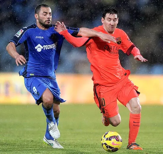 Lionel Messi (phải, Barcelona) bất lực trong sự kềm kẹp của cầu thủ Getafe.