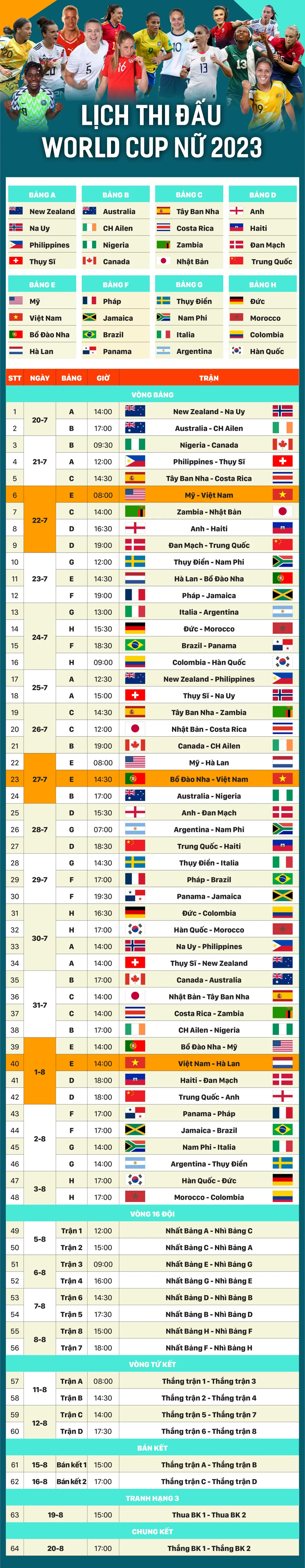 World Cup nữ 2023 sẽ diễn ra từ ngày 20-7 đến 20-8 tại Australia và New Zealand với cuộc chiến ở 8 bảng. Tuyển Việt Nam nằm chung bảng E với tuyển Mỹ, Hà Lan, Bồ Đào Nha. Xin giới thiệu lịch thi đấu 64 trận của giải theo giờ Việt Nam.
