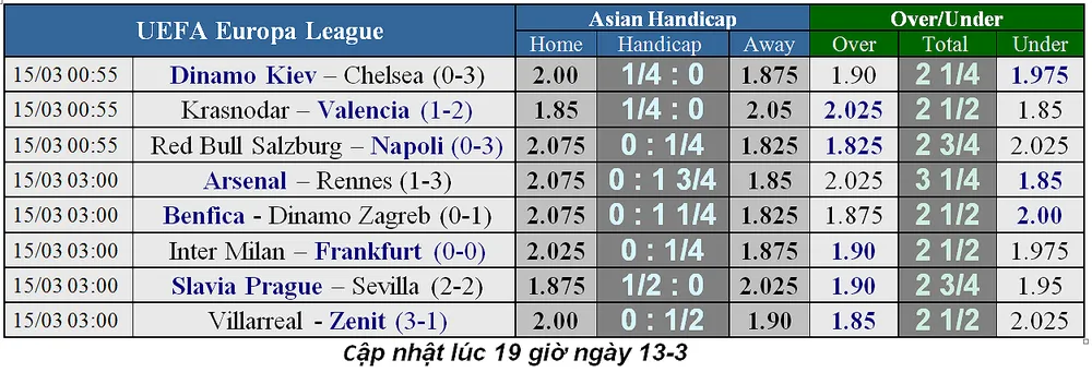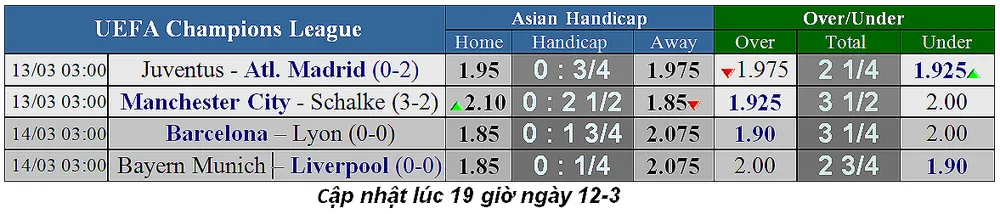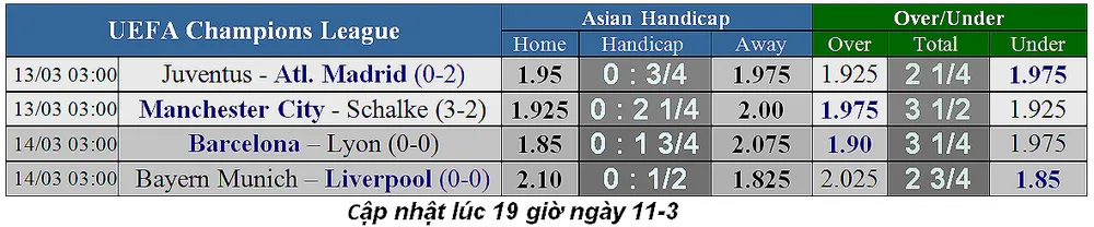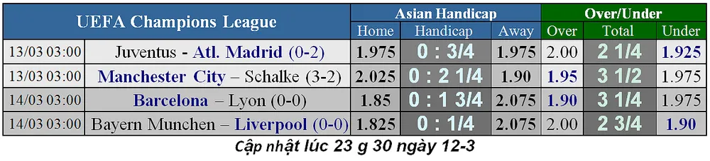 Thị trường đã biến động khá nhiều khi người ta tin là "cú sốc kèo dưới" ở Champions League đã dừng lại. Đêm qua, kèo trên thắng lớn khi Juventus và Man City đều giành chiến thắng đậm đà (Juve thắng Atletico 3-0, còn City thắng Schalke 7-0). Liệu đêm nay, chuyện đó sẽ tái diễn?