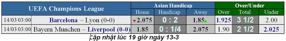 Trận Barcelona - Lyon kèo chấp từ 1 trái rưỡi 2 trái (cho lựa) hôm qua nay đã chuyển hẳn thành 2 trái chẵn, nhưng dường như người ta vẫn cứ đặt vào cửa trên. Xem chừng, Barca sẽ thắng rất đậm trận này, trong lúc giá cả cùa Bayern vẫn cứ chập chờn, lúc lên lúc xuống, cho thấy không ít người vẫn tin vào Bayern.