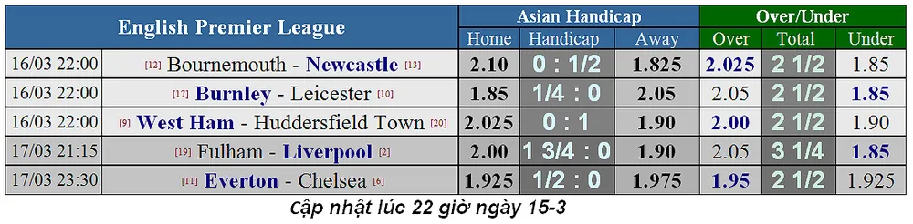 Có vẻ như trận Fulham - Liverpool sẽ diễn ra với kịch bản giống y như trận tứ kết Cúp FA giữa Swansea - Manchester City. Đội khách chấp quá đậm, đến 2 trái rưỡi 3 trái mà thị trường cứ đổ vào cửa trên, nên trận đấu khởi đầu với cú sốc: Swansea dẫn 2-0 sau 45 phút dù City cầm bóng đến 80%. Chỉ có điều là trong giờ giải lao kèo vẫn chấp hơn 2 trái, nên thị trường chuyển sang cửa dưới, thế là City ghi luôn 3 bàn, thắng ngược 3-2 ỡ hiệp sau, khiến không ít tay chơi thua trắng cả 2 kèo.