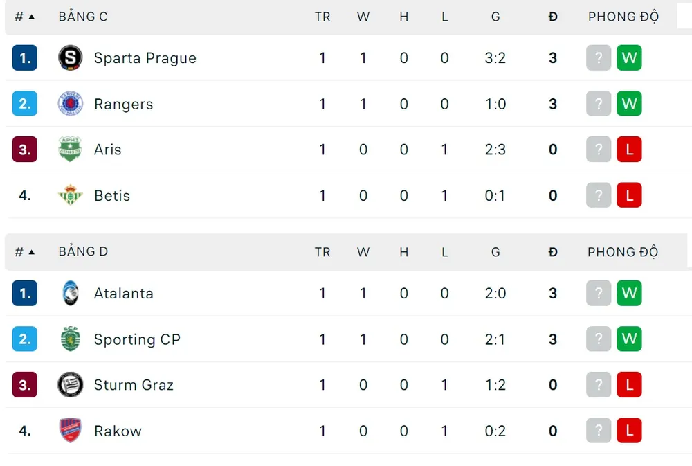 Sparta Prague gặp Rangers (bảng C) và Atalanta gặp Sporting (bảng D) là những trận phân định ngôi đầu bảng khi tất cả đều đang có 3 điểm trong tay.