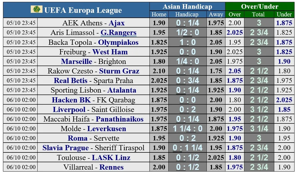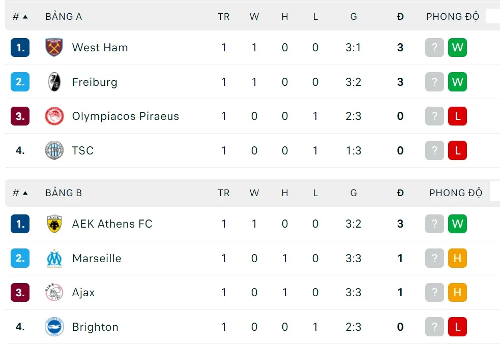 Ở trận mở màn bảng A cách đây hai tuần, West Ham đã lội ngược dòng đánh bại Backa Topola 3-1, nhưng CLB Đức Freiburg còn có vẻ lợi hại hơn khi thắng 3-2 trên sân Olympiacos. Vì thế trận đấu trên sân Freiburg sẽ không dễ dàng chút nào cho đội bóng London. Ở bảng B, Brighton bất ngờ để thua AEK Athens 2-3 trên sân nhà, nên phải bắt đầu bằng vị trí chót bảng khi chơi trên sân Marseille đêm nay. Ngôi đầu bảng trong tay AEK Athens sẽ bị Ajax thách thức sau khi CLB Hà Lan cầm hòa Marseille trên sân nhà tuần qua.