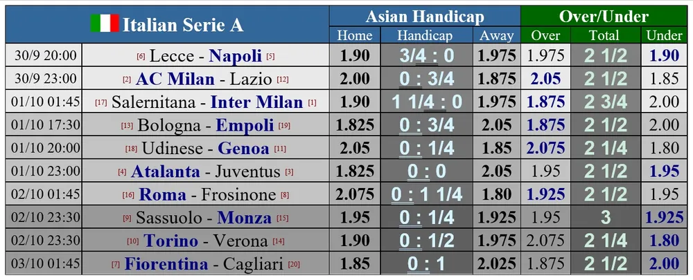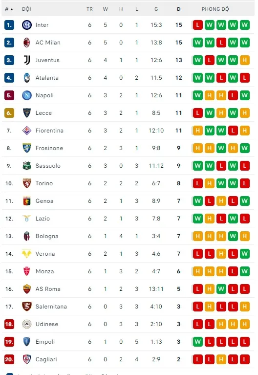 Lượt đấu giữa tuần ở Serie A cũng mang đến nhiều bất ngờ khi đội đầu bảng Inter bất ngờ để thua Sassuolo 1-2 ngay trên sân nhà. Dù AC Milan thắng 3-1 trên sân Cagliari, Inter vẫn giữ được ngôi đầu nhờ hơn hiệu số bàn thắng. Sang vòng 8, Inter có cơ hội cùng cố ngôi đầu bảng khi kéo quân đến sân Salernitana, trong lúc AC Milan gặp khó khi tiếp cường địch Lazio.