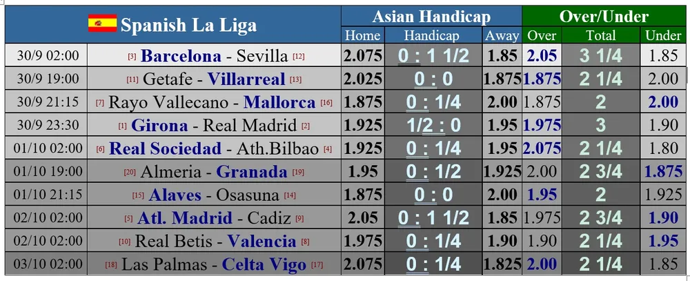 Real Madrid hiện có 18 điểm, kém 1 điểm so với đội đầu bảng Girona, đội mới thăng hạng mùa trước. Hai lần gặp gỡ mùa qua là những kết quả hết sức bất ngờ khi Real Madrid bị đội tân binh cầm hòa 1-1 sân nhà và thua 2-4 trên sân khách. Girona đang chơi với phong độ rất cao khi hòa 1 và thắng 6 trận, trong đó có những chiến thắng ấn tượng trước Mallorca, Villarreal và Sevilla. Dù Madrid chơi trên sân khách, nhưng nhà cái vẫn tin họ sẽ thắng đối thủ kém tiềm lực hơn mình.