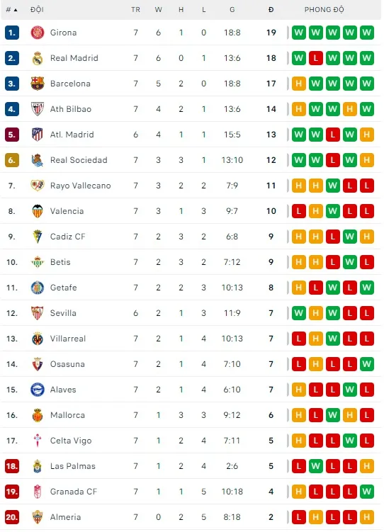 Sau khi thua trận derby, Real Madrid đã hồi phục bằng chiến thắng Las Palmas hôm giữa tuần để vươn lên vị trí thứ 2, trong lúc Barca tụt xuống thứ 3 sau trận hòa trên sân Mallorca. Cuối tuần này, Kền kền trắng sẽ gặp đội đầu bảng Girona với hy vọng chiếm lại ngôi đầu bảng.