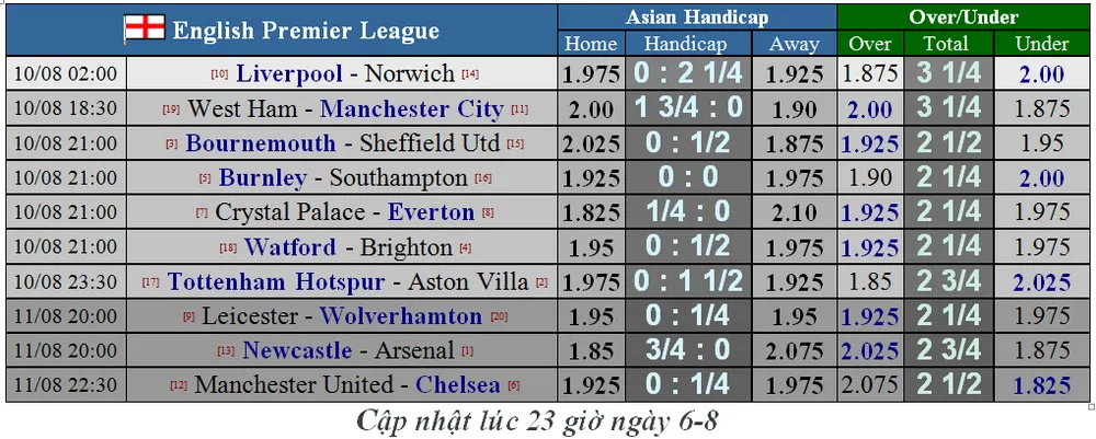 Lịch thi đấu Ngoại hạng Anh mùa giải 2019-2020, vòng 1 ngày 10-8 (Mới cập nhật)