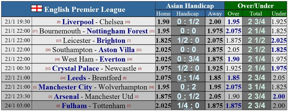Vòng 21 cũng ghi dấu nhiều trận cầu nảy lửa như trận derby London giữa Fulham và Tottenham hay trận derby khác của nước Anh khi Liverpool tiếp đón Chelsea, trận đấu giữa 2 gã khổng lồ đang sa sút.