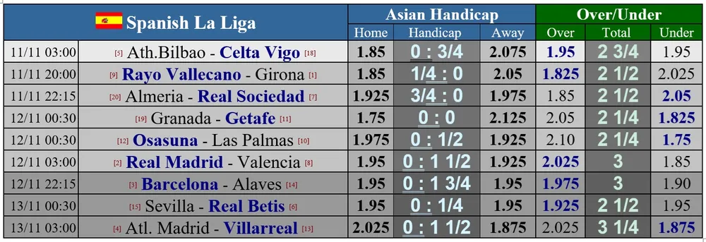 Trận hòa Rayo Vallecano tuần qua khiến Real Madrid tụt lại sau Girona trên bảng xếp hạng với 2 điểm cách biệt, trong lúc Barcelona tạm xếp thứ 3 với khoảng cách 4 điểm. Khoảng cách đó liệu có thu ngắn ở vòng 13 này? Câu trả lời có lẽ trông cậy vào sức kháng cự của Rayo Vallecano khi tiếp Girona trên sân nhà. Rayo vừa cầm chân Real Madrid ngay tại Bernabeu, nhưng Girona không thua trong 2 chuyến làm khách ở Vallecano nên hòa có lẽ là một bất ngờ của vòng đấu này.