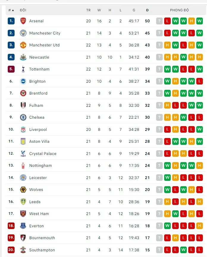 Bảng xếp hạng hiện thời