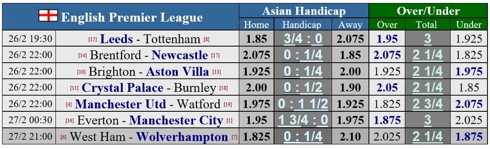 Hai trận cầu đinh giữa Arsenal – Liverpool và Chelsea – Leicester đã phải dời lại cho trận chung kết Cúp Carabao tại Wembley vào Chủ nhật. Nhưng vòng 27 vẫn còn nhiều cuộc đụng độ máu lửa. Đội đầu bảng Manchester City sẽ gặp đối thủ đanhg khốn đốn Everton, West Ham và Wolves gặp nhau trong cuộc đua giành một suất dự cúp châu Âu và Newcastle đến thăm Brentford trong một trận đấu có quan trọng trong cuộc chiến trụ hạng.