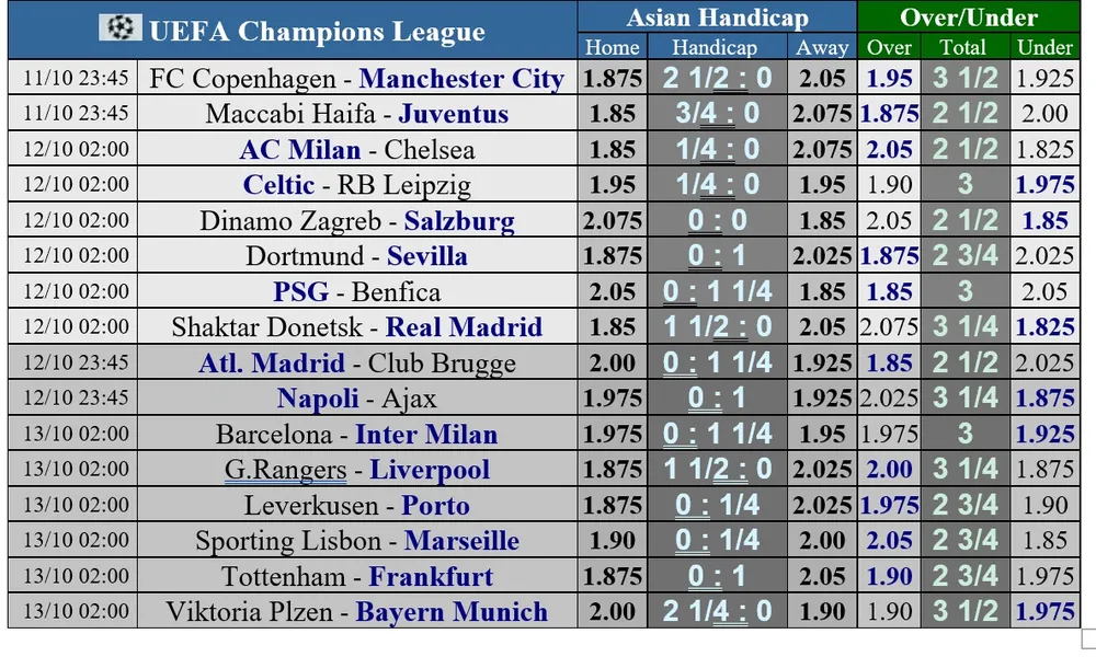 Man City sau chiến thắng giòn giã 5-0 trước FC Copenhagen ở bảng G sẽ dồn sức thắng luôn trận lượt về ở Đan Mạch để lấy vé sớm vào vòng knock-out. Borussia Dortmund cũng có thể theo chân CLB Anh để vào vòng sau nếu thắng tiếp Sevilla trên sân nhà sau khi đã gây sốc bằng chiến thắng 4-1 ở Tây Ban Nha.