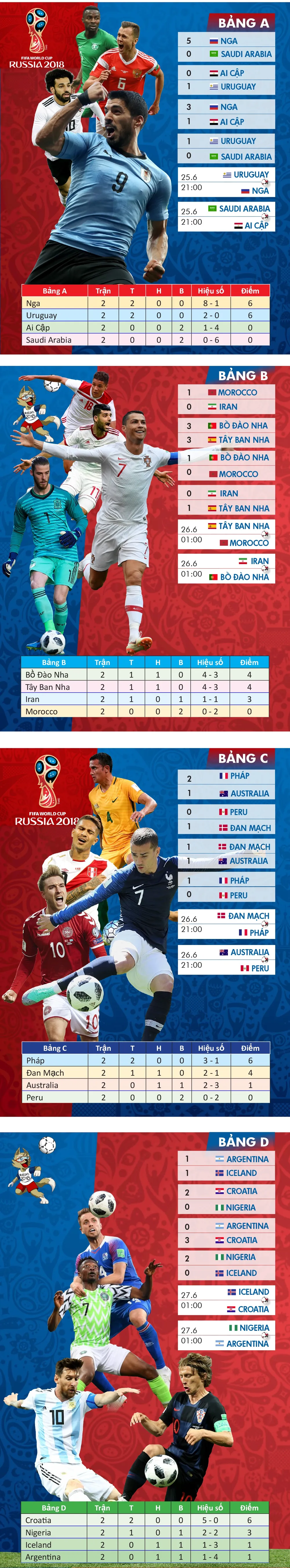 World Cup 2018 đã bước vào giai đoạn quyết định ngôi thứ ở vòng bảng. SGGP Online thực hiện Infographic Lịch thi đấu WORLD CUP 2018 (chia theo bảng), kèm bảng xếp hạng để bạn đọc tiện theo dõi.
