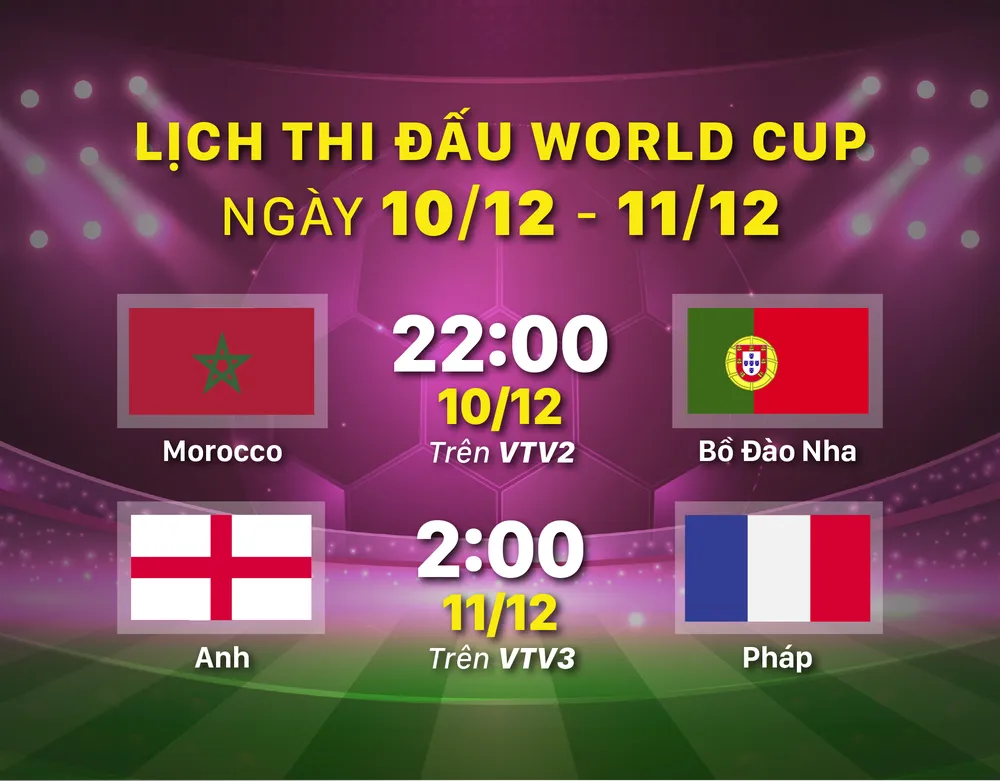 Lịch thi đấu Vòng tứ kết World Cup 2022 ngày 10-12 và 11-12