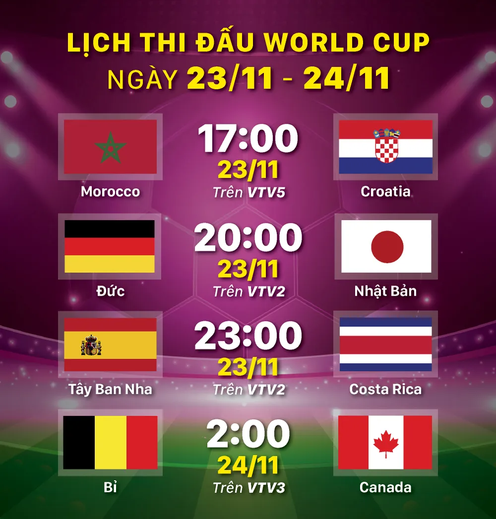 Lịch thi đấu World Cup 2022 bảng E và bảng F: 17h00 ngày 23-11: Morocco vs Croatia; 20h00 ngày 23-11: Đức vs Nhật Bản; 23h00 ngày 23-11: Tây Ban Nha vs Costa Rica; 2h00 ngày 24-11: Bỉ vs Canada