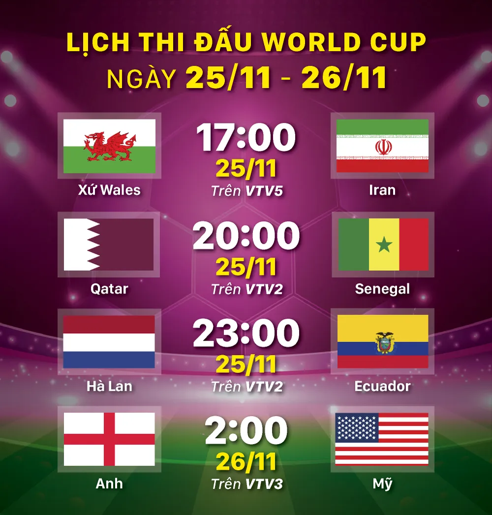 Lịch thi đấu World Cup 2022 bảng A và bảng B: 17h00 ngày 25-11: Xứ Wales vs Iran; 20h00 ngày 25-11: Qatar vs Senegal; 23h00 ngày 25-11: Hà Lan vs Ecuador; 2h00 ngày 26-11: Anh vs Mỹ