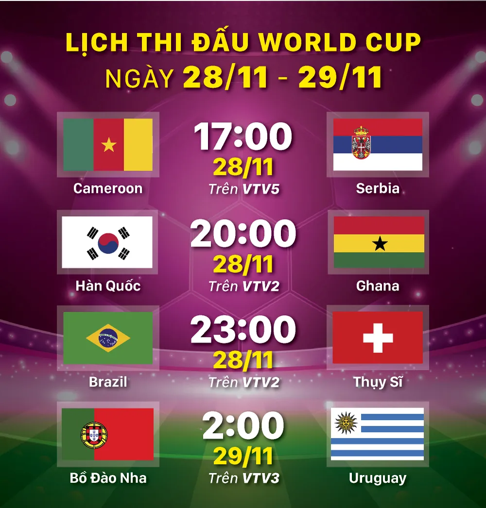 Lịch thi đấu World Cup 2022 bảng G và bảng H: 17h00 ngày 28-11: Cameroon vs Serbia; 20h00 ngày 28-11: Hàn Quốc vs Ghana; 23h00 ngày 28-11: Brazil vs Thụy Sĩ; 2h00 ngày 29-11: Bồ Đào Nha vs Uruguay