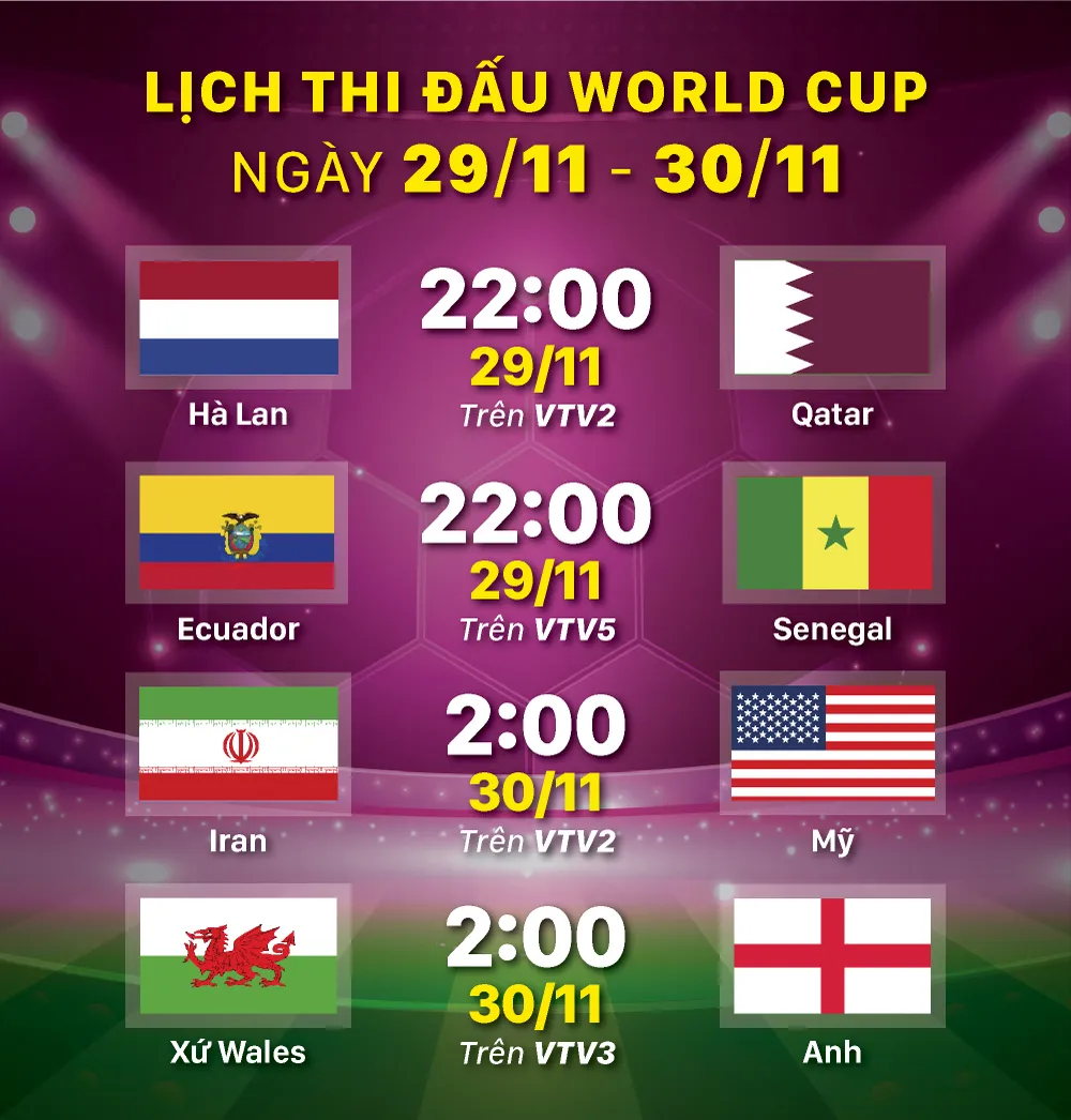 Lịch thi đấu World Cup 2022 bảng A và bảng B: 22h00 ngày 29-11: Hà Lan vs Qatar; 22h00 ngày 29-11: Ecuador vs Senegal; 2h00 ngày 30-11: Iran vs Mỹ; 2h00 ngày 30-11: Xứ Wales vs Anh