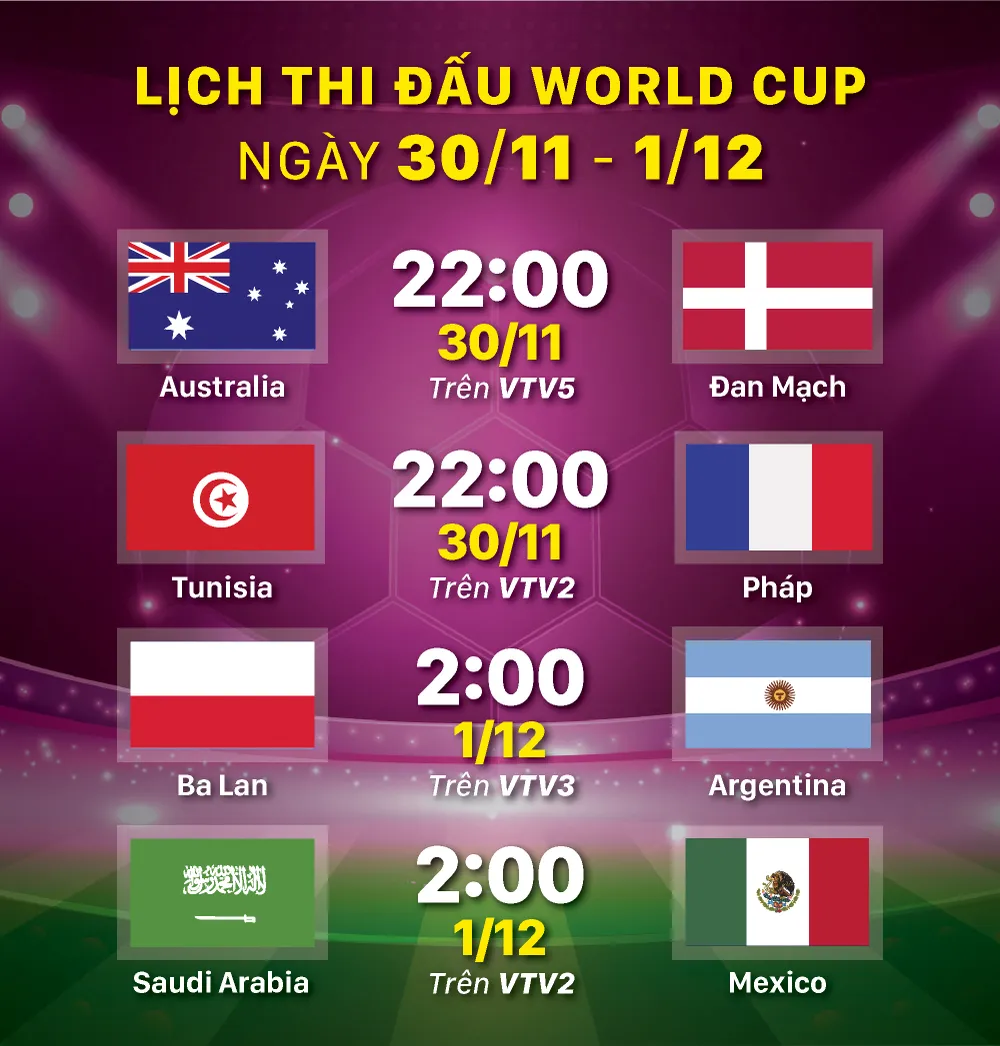 Lịch thi đấu World Cup 2022 bảng C và bảng D: 22h00 ngày 30-11: Tunisia vs Pháp; 22h00 ngày 30-11: Australia vs Đan Mạch; 2h00 ngày 1-12: Ba Lan vs Argentina; 2h00 ngày 1-12: Saudi Arabia vs Mexico