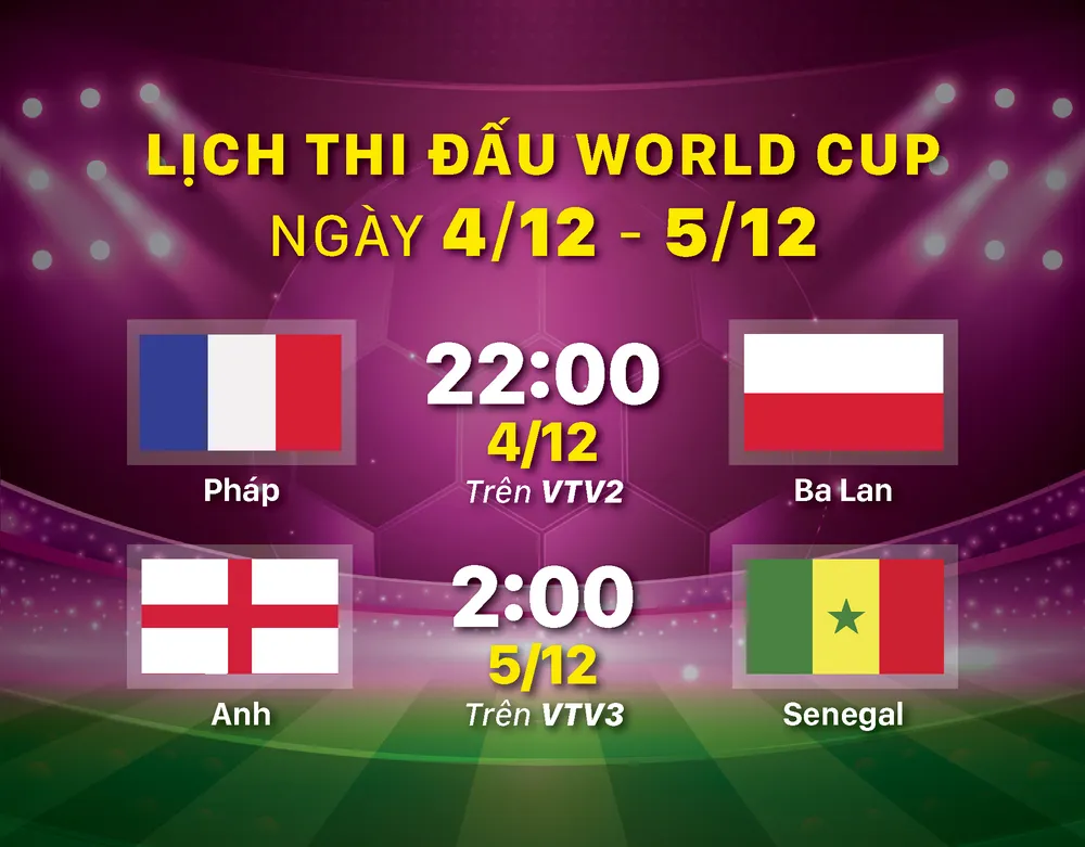 Lịch thi đấu Vòng 1/8 World Cup 2022 ngày 4-12 và 5-12 Trận 3: 22h00 ngày 4-12: Pháp vs Ba Lan Trận 4: 2h00 ngày 5-12: Anh vs Senegal