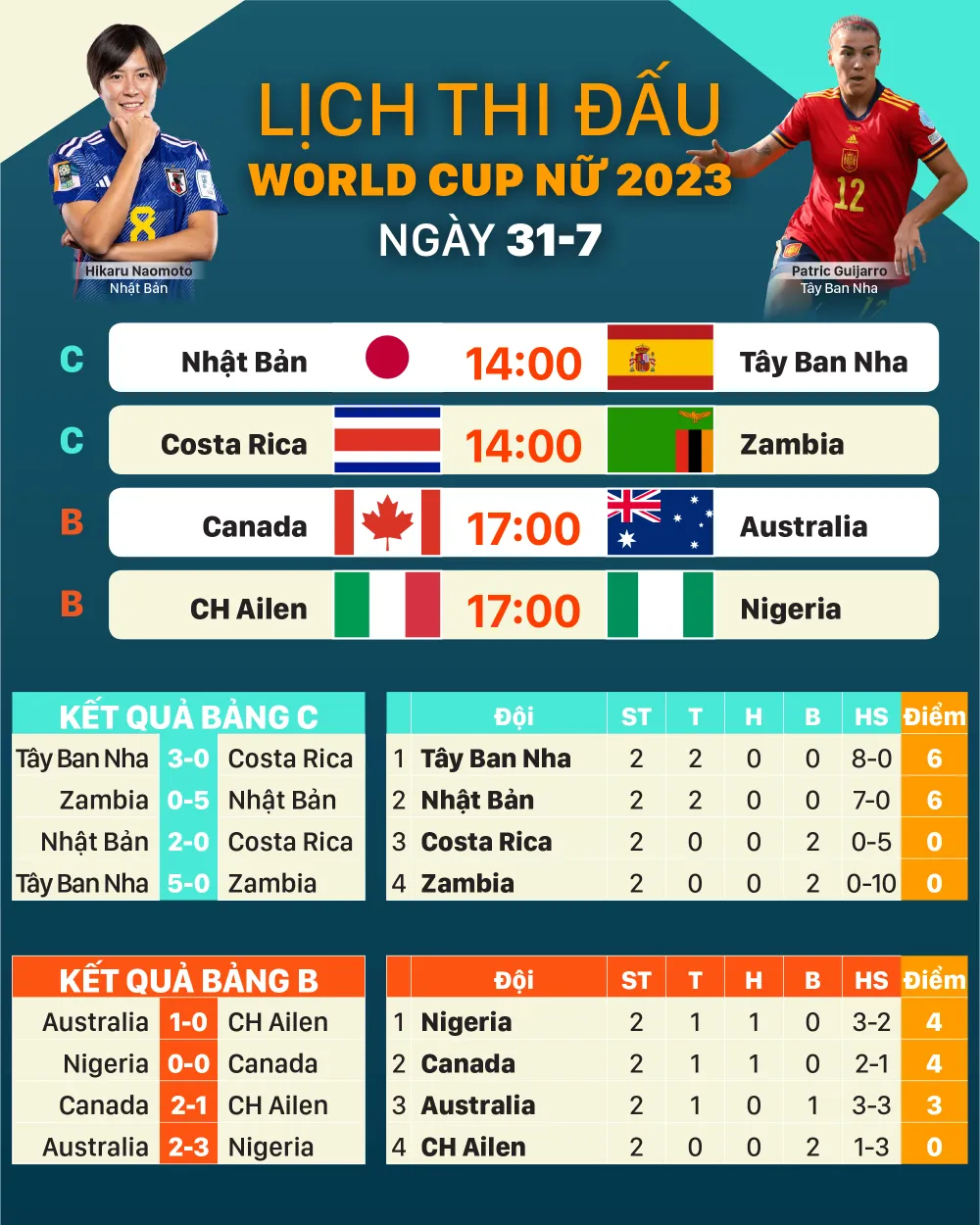 Lịch thi đấu World Cup nữ 2023 bảng B và bảng C: Nhật Bản vs Tây Ban Nha; Costa Rica vs Zambia;  Canada vs Australia;  CH Ailen vs Nigeria