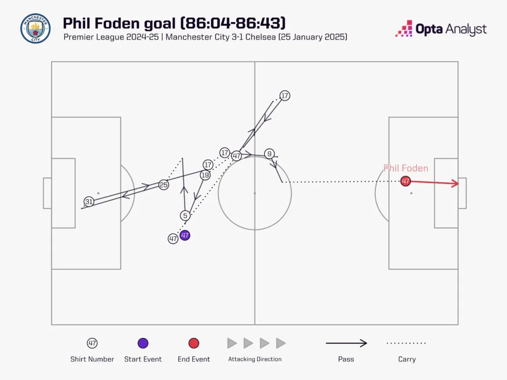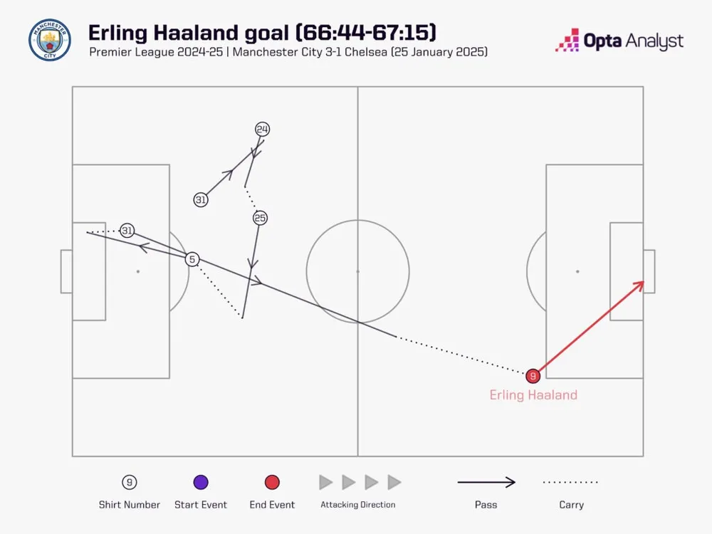 Những đường chuyền dài của Man City cũng rất hiệu quả. Đường chuyền vượt tuyến của Ilkay Gündogan đến Matheus Nunes cuối cùng đã dẫn đến bàn gỡ hòa của Josko Gvardiol, sau khi Noni Madueke giúp Chelsea vươn lên dẫn trước sớm. Hai đường chuyền dài khác đến từ chân thủ môn Ederson. Anh tìm thấy Erling Haaland bằng một đường chuyền dài, và cuối cùng tiền đạo người Na Uy đã thực hiện pha lốp bóng qua đầu Robert Sánchez để nâng tỷ số lên 2-1. Ederson cũng thực hiện một đường chuyền đến vạch giữa sân, được Kevin De Bruyne chuyền tiếp trước khi Haaland kiến tạo để Phil Foden ấn định chiến thắng ở phút bù giờ.
