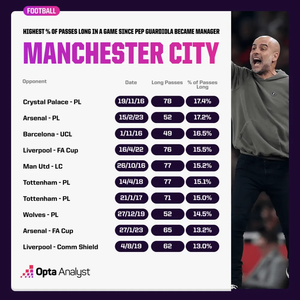 Trong ba trận đấu tiếp theo tại Premier League, Man City không thực hiện quá 7,9% đường chuyền dài và không thắng trận nào (hòa 2, thua 1), mặc dù điều này bao gồm trận hòa 2-2 trên sân Etihad đầu mùa giải, nơi bản chất tấn công-phòng ngự của hiệp hai có thể đã ảnh hưởng đến thống kê sau thẻ đỏ của Leandro Trossard.