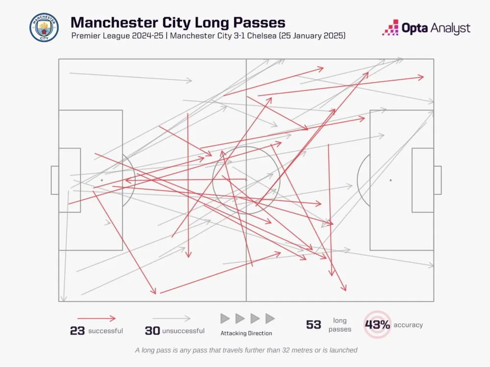 Điều này không nhất thiết có nghĩa là chơi bóng dài theo kiểu “đá bóng lên trời” về phía đối thủ. Nó vẫn có thể là một đường chuyền có chủ đích và chính xác đến đồng đội ở vị trí trống. Trong trận đấu với Chelsea vào cuối tuần trước, Man City đã thực hiện 53 đường chuyền dài. Con số này chiếm 9,4% tổng số đường chuyền của họ trong trận đấu (567), tỷ lệ cao nhất của Man City trong bất kỳ trận đấu Premier League nào mùa này. Tỷ lệ cao thứ hai là 8,8% trong trận thua 1-2 trên sân nhà trước Manchester United vào giữa tháng 12, và thứ ba là 8,7% trong trận hòa 2-2 trước Brentford vào giữa tháng 1.