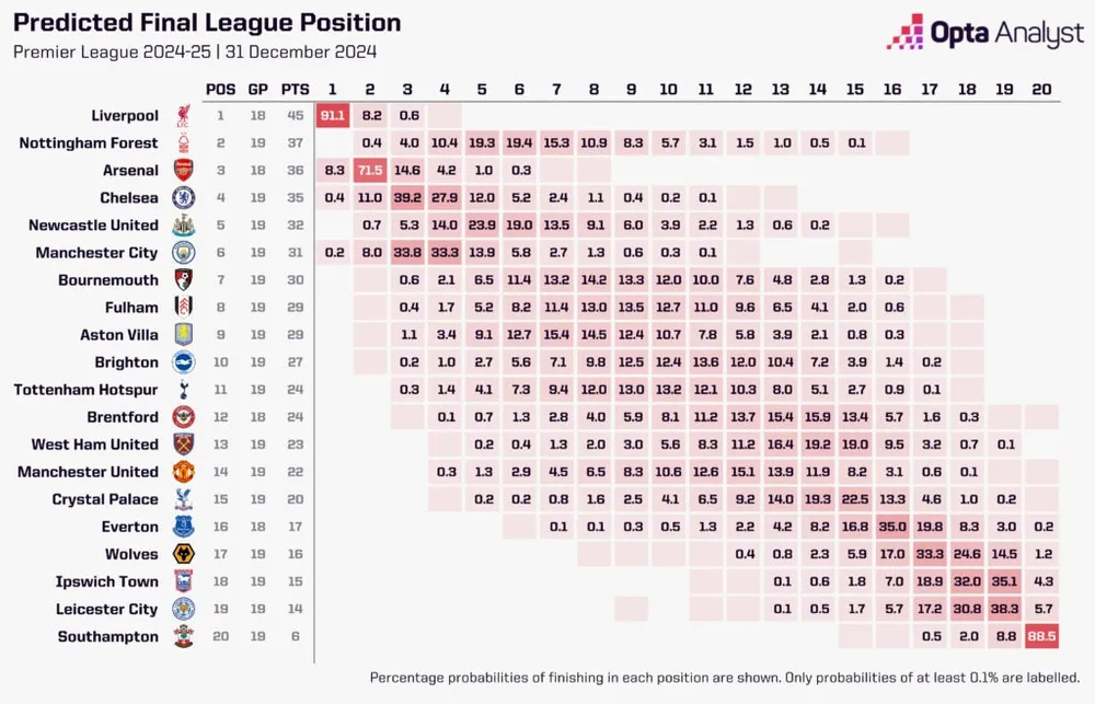 Tất nhiên, không có tiền lệ nào để siêu máy tính bám vào liên quan đến việc Man Utd đang trong cuộc chiến trụ hạng. Tuy nhiên, các màn trình diễn gần đây và sức mạnh của đối thủ sắp tới cũng được siêu máy tính tính đến, vì vậy nếu bị đẩy vào thế khó và Man United bị kéo vào cuộc chiến sinh tồn, các con số sẽ không chỉ xem xét dữ liệu lịch sử.
