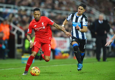 Nathaniel Clyne (trái, Liverpool) tranh bóng với Ayoze Perez (Newcastle).