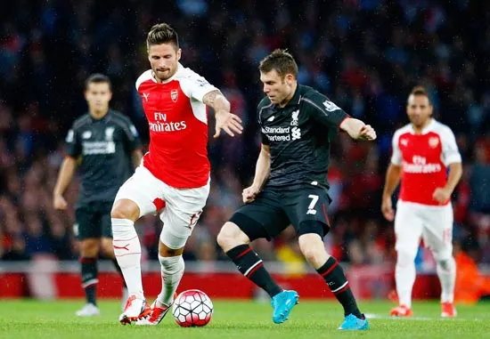 Olivier Giroud (trái, Arsenal) tranh bóng với James Milner (Liverpool) ở lượt đi.