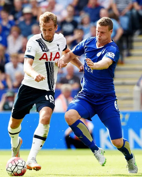 Harry Kane (trái, Tottenham) tranh bóng với Robert Huth (Leicester).