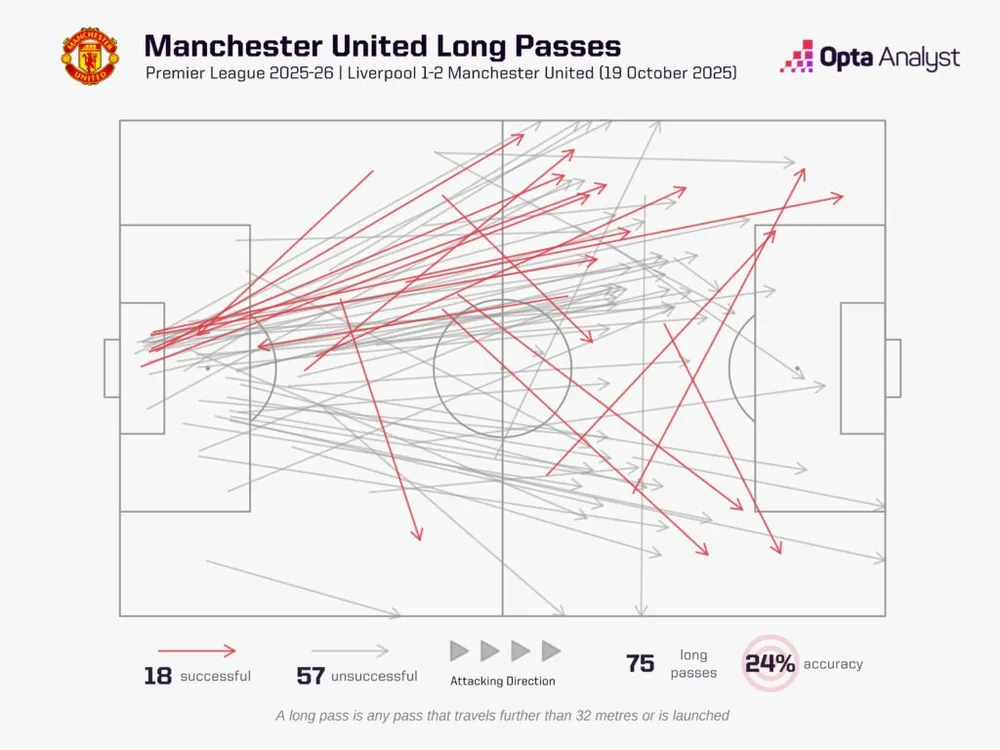 Thực tế là 75 trong số 294 đường chuyền của Man United trong chiến thắng ở tại Anfield là bóng dài. Với tỷ lệ 25,5%, đây là tỷ lệ bóng dài lớn nhất của họ trong một trận đấu Premier League kể từ tháng 12 -2017 đối đầu với Arsenal (27,9%).