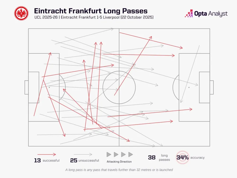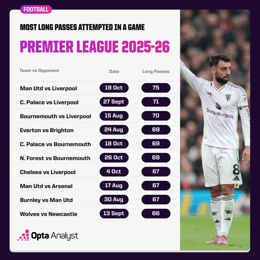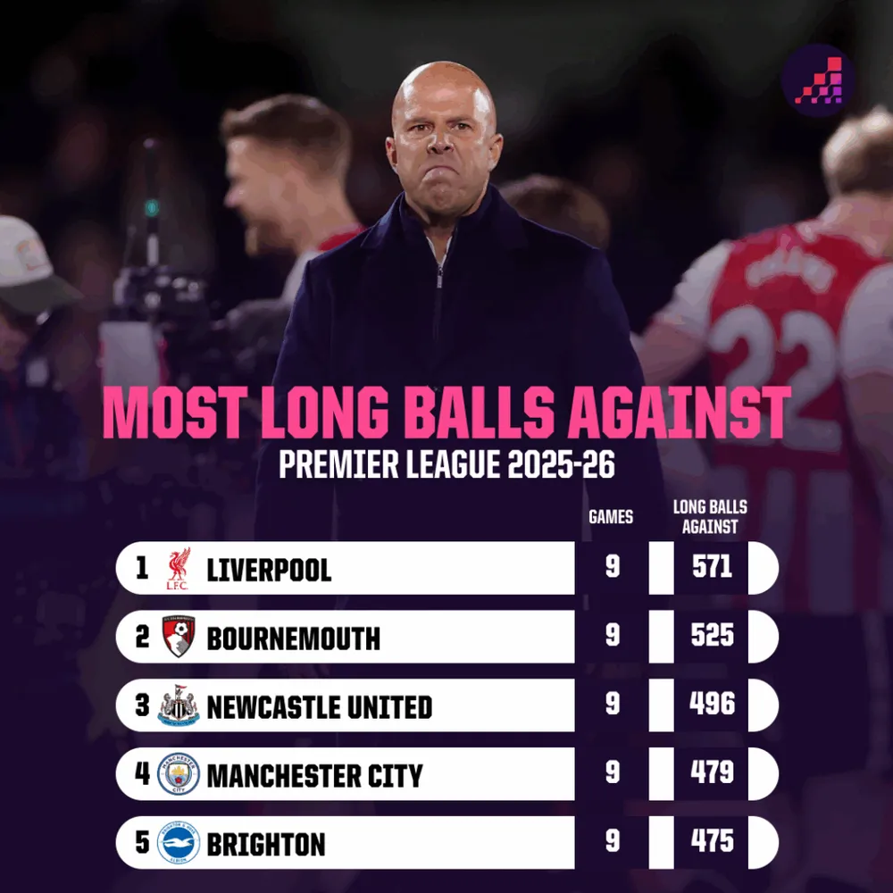 Tổng cộng, The Reds đã phải đối mặt với 571 đường chuyền dài tại Premier League mùa này, nhiều hơn ít nhất 46 đường so với bất kỳ đội nào khác, trong khi Bournemouth (525) là đội duy nhất khác thậm chí phải đối mặt với hơn 500 đường chuyền dài. 20,5% tổng số đường chuyền đối phương, đây cũng là tỷ lệ lớn nhất mà bất kỳ đội nào trong giải đấu phải đối mặt trong mùa giải 2025-26. Xét theo từng trận đấu riêng lẻ, ba tổng số bóng dài cao nhất mùa này đều đến trong các trận đấu với Liverpool – 75 đối đầu Man Utd, 71 đối đầu Crystal Palace và 70 đối đầu Bournemouth.