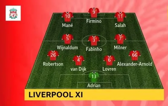 Đội hình Liverpool: Adrian, Alexander-Arnold, Van Dijk, Lovren, Robertson, Milner, Faninho, Wijnaldum, Mane, Salah, Firmino. Dự bị: Kelleher, Keita, Gomez, Henderson, Lallana, Origi, Elliott