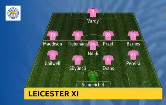 Đội hình Leicester: Schmeichel, Pereira, Soyuncu, Evans, Chilwell, Tielemans, Barnes,Praet, Ndidi, Maddison, Vardy.