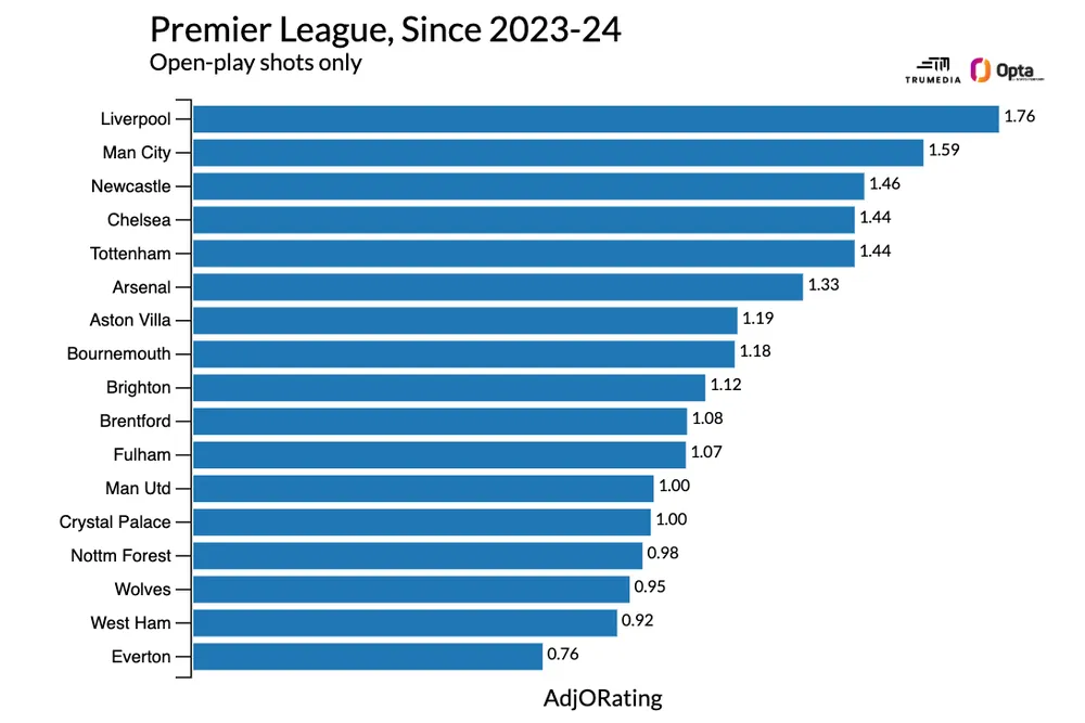 Hiệu suất tấn công trong tình huống mở chỉ ở mức trên trung bình không chỉ do chấn thương của Bukayo Saka, Kai Havertz, Martin Ødegaard và những người khác trong mùa này. Arsenal chơi tốt hơn trong các pha tấn công mở ở mùa trước, nhưng họ vẫn chỉ xếp thứ năm trong giải đấu theo chỉ số bàn thắng điều chỉnh.