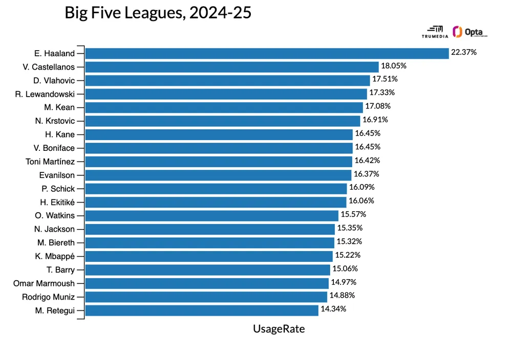 Có nhiều ví dụ khác về các đội phát triển mạnh mà không có cầu thủ sử dụng bóng nhiều trong đội hình. Mùa trước, Real Madrid vô địch La Liga và Champions League mà không có tiền đạo trung phong thực thụ. Dù Kylian Mbappé không hẳn là tiền đạo truyền thống, anh vẫn thuộc kiểu “sử dụng nhiều lượt sở hữu bằng các cú sút cá nhân”. Họ chiêu mộ anh – và giờ khó có khả năng giành danh hiệu nào trong mùa này. Họ ghi 2,29 bàn mỗi trận mùa trước; mùa này giảm xuống dưới 2,1.