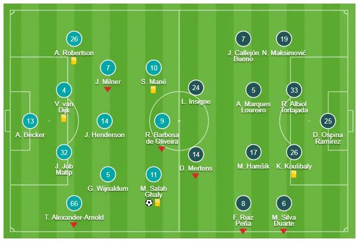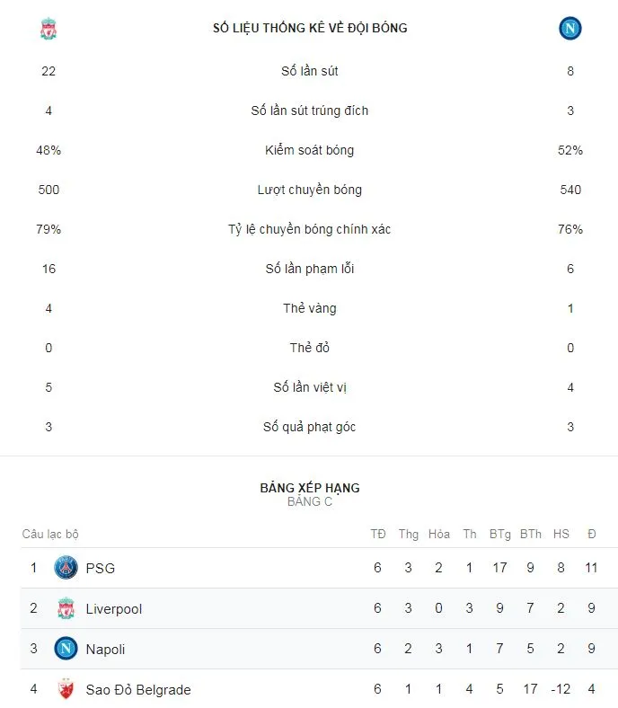 Ngôi sao Mohamed Salah tiếp tục thăng hoa mang về bàn thắng quý giá giúp Liverpool giành tấm vé đi tiếp dù đối thủ Napoli đã ở rất gần tấm vé vào vòng 16 đội. Kết thúc vòng bảng, Liverpool và Napoli có cùng 9 điểm, bằng hiệu số, thành tích đối đầu nhưng đoàn quân của HLV Klopp giành quyền đi tiếp nhờ ghi nhiều bàn thắng hơn (9 so với 7).