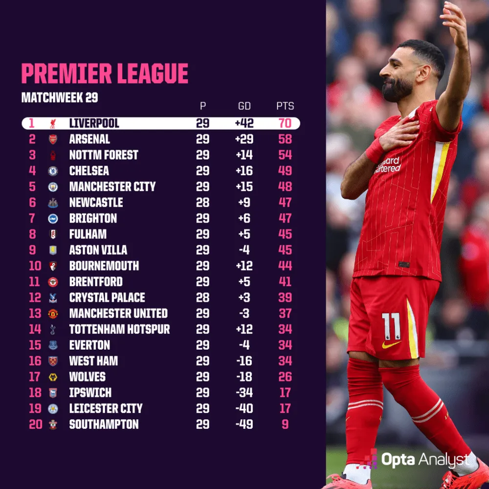 Liverpool hiện có 70 điểm, vì vậy đội bóng của Slot biết rằng họ sẽ giành được danh hiệu thứ 20 ở giải đấu cao nhất nước Anh và chiếc cúp Premier League thứ hai miễn là họ kiếm được 16 điểm từ 9 trận cuối, bất kể Arsenal làm gì.