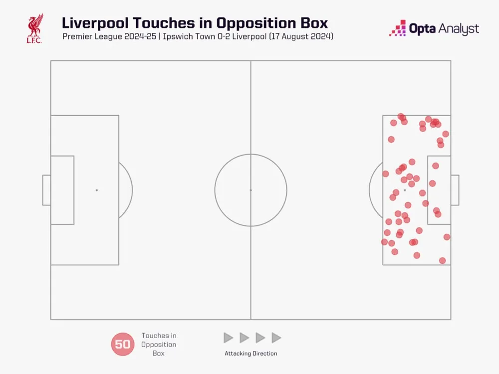 Những dấu hiệu tích cực xuất hiện ngay lập tức. Trong trận mở màn thắng Ipswich Town 2-0 tại Portman Road, Liverpool có 50 lần chạm bóng trong vòng cấm đối phương – kỷ lục cho một đội bóng trong trận ra mắt của một HLV tại Premier League kể từ mùa 2008-09, theo thống kê của Opta.