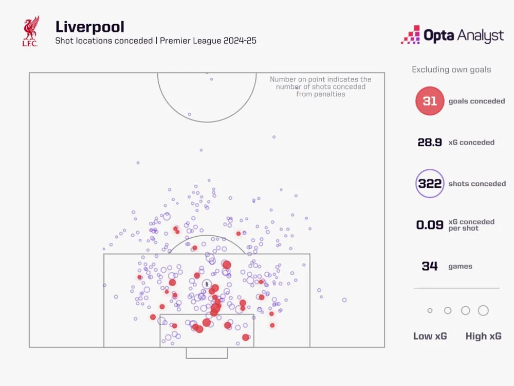 So với mùa trước (đối mặt 10.9 cú sút mỗi trận, xG thủng lưới 1.22 mỗi trận), mùa này Liverpool chỉ đối mặt 9.5 cú sút mỗi trận và xG thủng lưới giảm xuống 0.85, cho thấy sự tiến bộ rõ rệt.