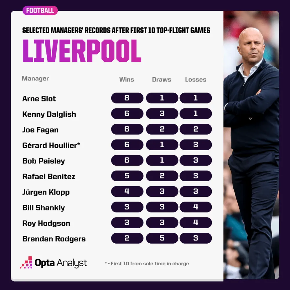 Liverpool thắng 8 trong 10 trận Premier League đầu tiên dưới thời Slot (hòa 1, thua 1), thành tích tốt nhất từ trước đến nay của một HLV Liverpool trong 10 trận đầu tiên tại giải đấu hàng đầu. Chiến thắng 2-0 trên sân nhà trước Aston Villa giúp Liverpool đạt 28 điểm sau chỉ 11 trận. Chỉ mùa 2019-20 (31 điểm) Liverpool có nhiều điểm hơn sau 11 trận, trong khi Guus Hiddink tại Chelsea là HLV duy nhất từng giành được nhiều điểm như vậy trong 11 trận đầu tiên tại Premier League (cũng 28 điểm). Tiếp theo là chiến thắng nghẹt thở 3-2 tại Southampton, đưa Slot cán mốc 10 chiến thắng Premier League chỉ trong 12 trận. Không HLV nào trong lịch sử giải đấu đạt 10 chiến thắng nhanh hơn (bằng với Hiddink và Carlo Ancelotti).