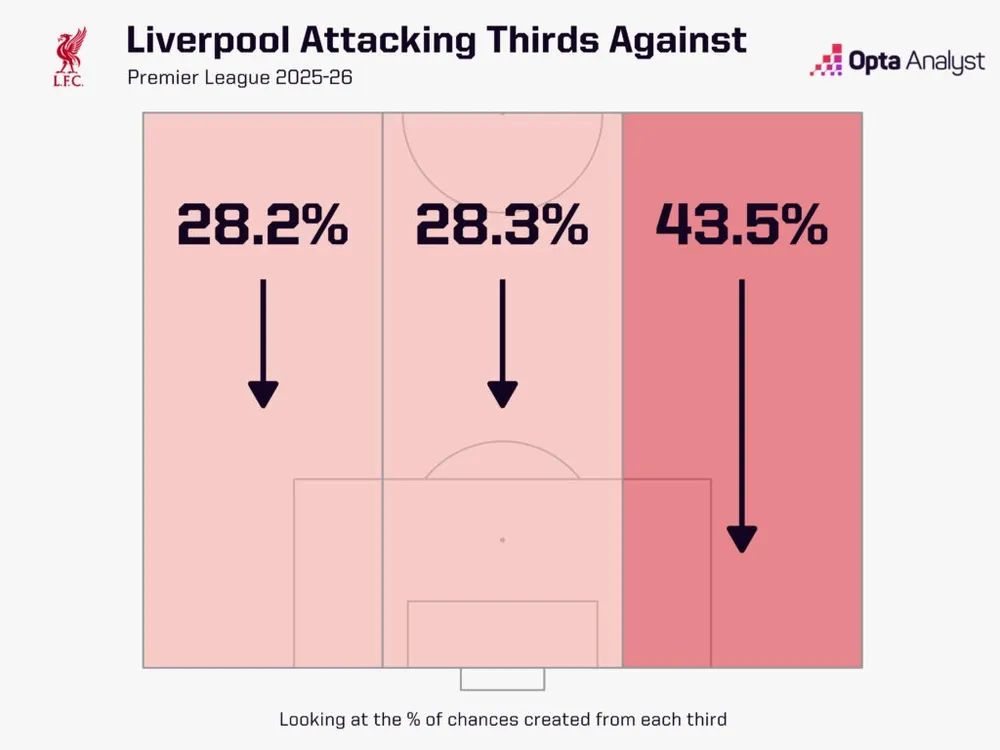 Trent Alexander-Arnold đã rời Liverpool, nhưng vấn đề ở hành lang phải vẫn chưa được giải quyết. Jeremie Frimpong, Conor Bradley hay thậm chí Szoboszlai khi được kéo lùi đều chưa tạo ra sự chắc chắn hơn. Thống kê cho thấy, 43,5% số cơ hội mà đối thủ Liverpool tạo ra xuất phát từ cánh phải – gần gấp rưỡi so với cánh trái (28,2%).
