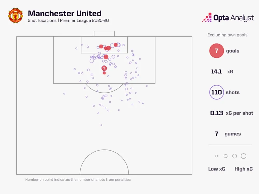 Nếu Liverpool có vấn đề về phong độ cá nhân, thì United lại đang đau đầu với khả năng chuyển hóa cơ hội. Dưới thời Ruben Amorim, “Quỷ đỏ” chơi tấn công mạnh mẽ, tung ra 110 cú sút sau 7 vòng, cao nhất giải, và tạo ra 14,1 xG, cũng là con số hàng đầu. Nhưng nghịch lý nằm ở chỗ: họ chỉ ghi được 9 bàn, thấp hơn 5,06 xG so với kỳ vọng – tệ nhất trong năm giải đấu lớn châu Âu.