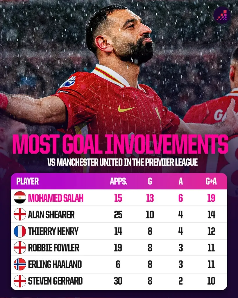Vậy thì, còn dịp nào và đối thủ nào tốt hơn để ngôi sao người Ai Cập tìm lại cảm giác ghi bàn của mình hơn là trận đấu với Manchester United vào Chủ nhật? Salah đã ghi nhiều bàn thắng (13) và có nhiều lần tham gia vào bàn thắng (19) vào lưới Man United hơn bất kỳ cầu thủ nào khác trong lịch sử Premier League.
