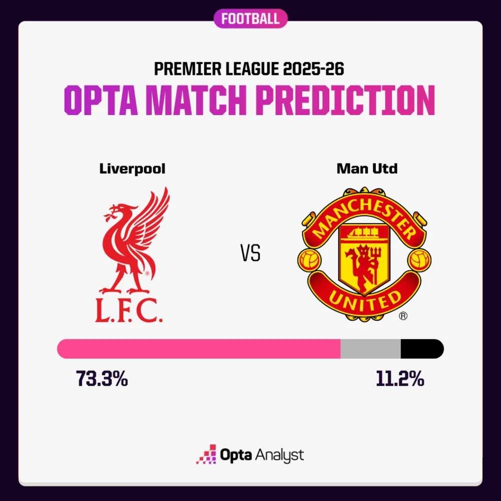 Theo mô hình thống kê của Opta, Liverpool có tới 73,3% khả năng thắng, trong khi Man United chỉ có 11,2% cơ hội rời Anfield với ba điểm. Kịch bản hòa chiếm khoảng 15,5% – cũng là kết quả của hai mùa gần nhất.