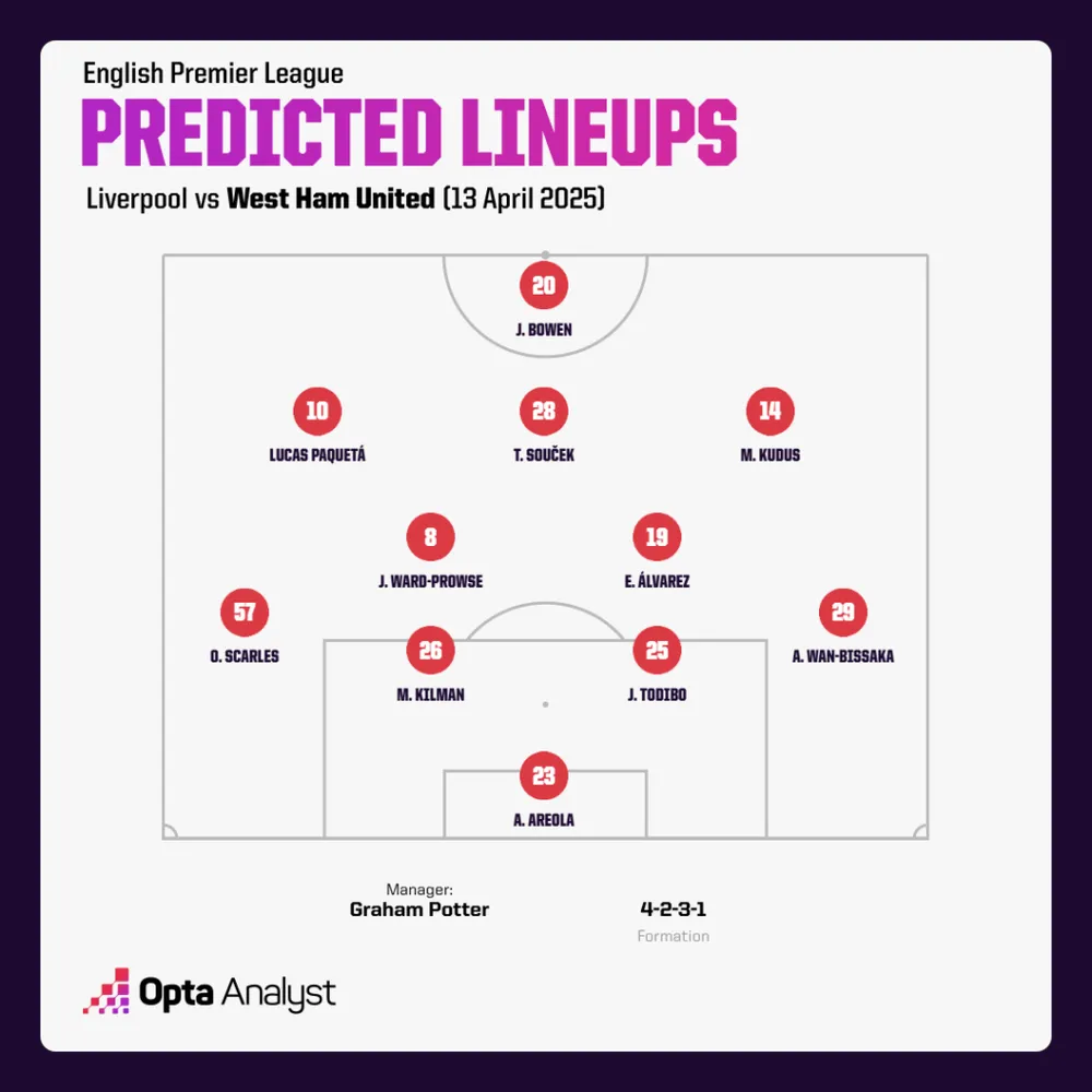 Mohammed Kudus được triệu hồi tuần trước nhưng đang trải qua chuỗi trận không ghi bàn dài nhất tại Premier League (13 trận), trong khi Evan Ferguson, mượn từ Brighton, không ghi bàn trong 14 trận, với sáu trận cho West Ham. Jarrod Bowen có thể là người thắp sáng đội bóng, với thành tích ấn tượng trước Liverpool. Anh tham gia trực tiếp vào sáu trong bảy bàn gần nhất của West Ham trước Liverpool trên mọi đấu trường (ba bàn, ba kiến tạo). Kể từ đầu mùa trước, không cầu thủ nào ghi nhiều bàn hơn (ba, ngang Alexander Isak) hoặc tham gia bàn thắng nhiều hơn (bốn, ngang Isak và Dominic Solanke) vào lưới Liverpool so với Bowen.