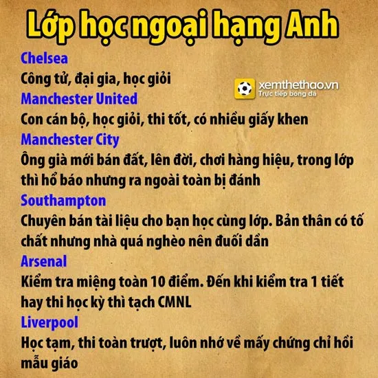 Ngoại trừ những định nghĩa vui nhộn về những “cậu học trò” vốn là những đội bóng nổi tiếng nhất ở Premier League do Fan Page Trực tiếp bóng đá đăng tải, người ta có thêm những định nghĩa khác về những “cậu học trò” khác như là: