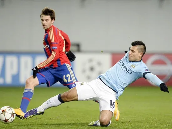 Sergio Aguero (phải) nỗ lực tranh bóng với Georgi Schennikov của CSKA Moscow.